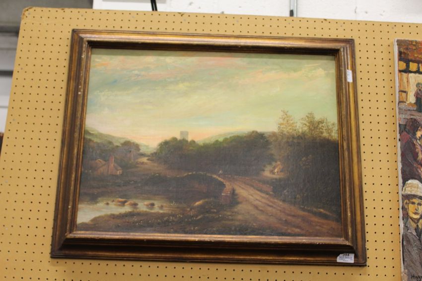 Figures crossing a stone bridge oil on canvas