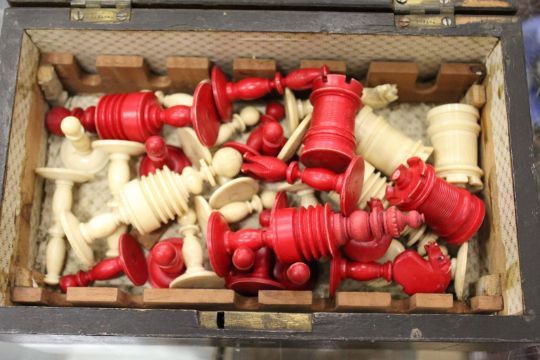 Early 20th century ivory chess pieces contained in an old box