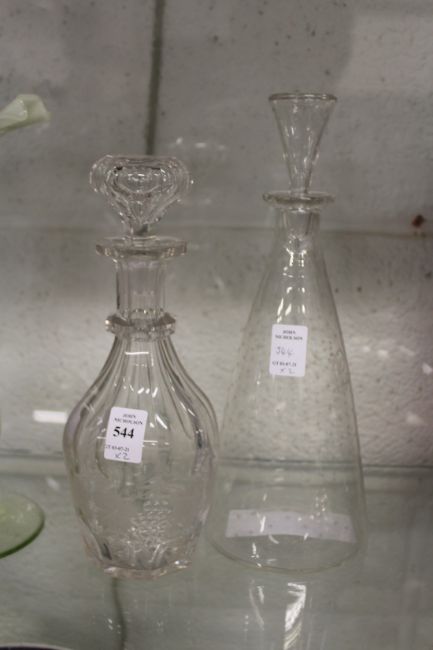 A good cut glass decanter engraved with grapes and vines together with a star cut decanter