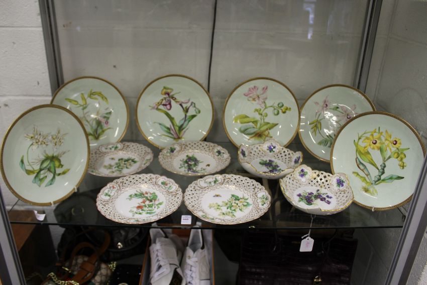 A set of six Meissen floral decorated small plates with pierced borders together with a pair of matching small dishes (one af) together with six botanical cabinet plates