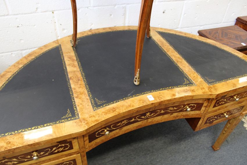 An impressive French style demi lune desk with leather inset top an arrangement of five drawers on tapering square legs