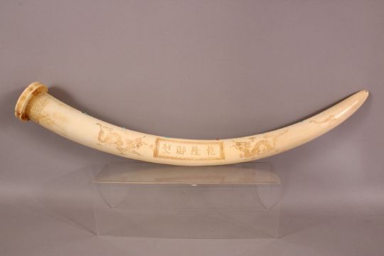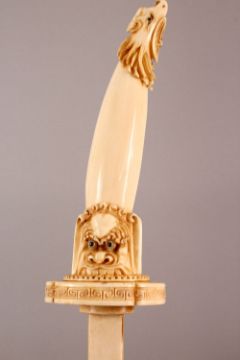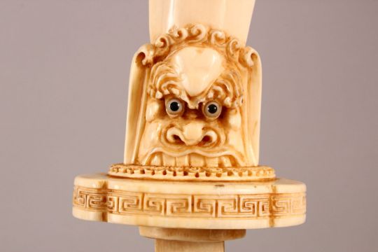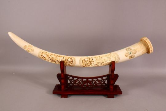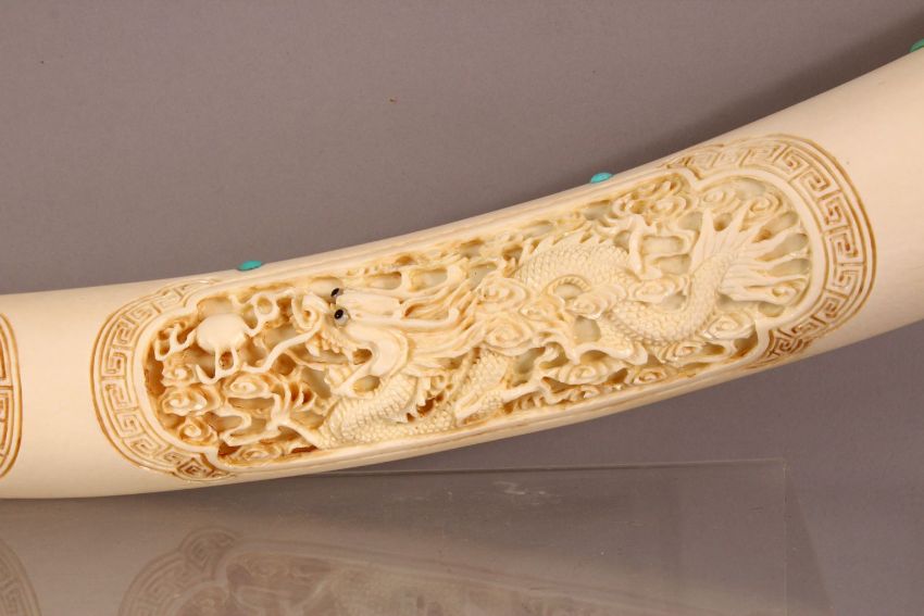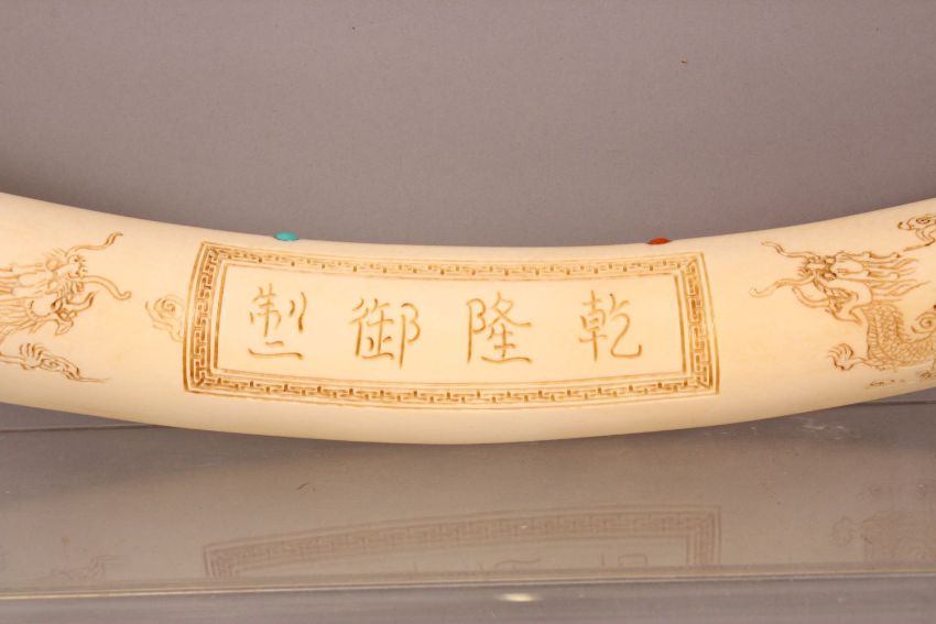 A LARGE LATE 19TH CENTURY / EARLY 20TH CENTURY CHINESE CARVED IVORY DISPLAY SWORD - the sheath carved with three panels of dragons and scrolling flora - the verso with incised dragons and a four character reign mark - inset with semi precious stones ( red & blue poss turquoise and coral ) the hilt carved in the form of a phoenix bird and lion dog - with a small display carved ivory blade - 81cm -