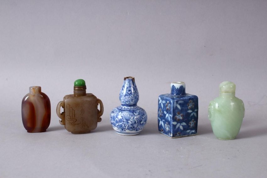 A MIXED LOT OF 5 CHINESE SNUFF BOTTLES, the lot comprising a small blue & white porcelain gourd Snuff bottle, 6cm, a small blue & iron red porcelain square form snuff bottle 6cm, two carved jade snuff bottles 6.5cm & one carved agate snuff bottle, 5cm. (5)