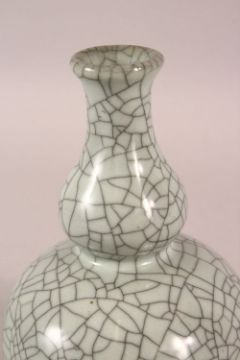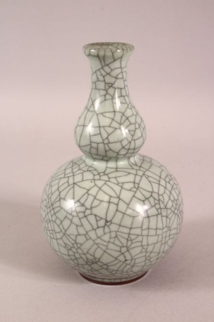 A SMALL 20TH CENTURY CHINESE CRACKLE GLAZED PORCELAIN DOUBLE GOURD VASE - 15CM