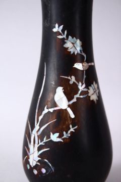 A CHINESE 20TH CENTURY INLAID MOTHER OF PEARL WOODEN VASE, inlaid with mother of pearl to depict scenes of a bird seated upon the branch of a tree, 20cm high.
