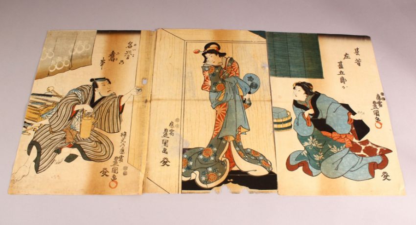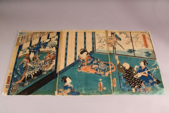 A COLLECTION OF MID 19TH CENTURY JAPANESE WOODBLOCK PRINTS, comprising two triptychs of Kabuki actors by Toyokuni II Utagawa 1777-1835, each section approx 37cm x 25cm.