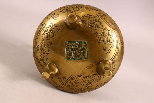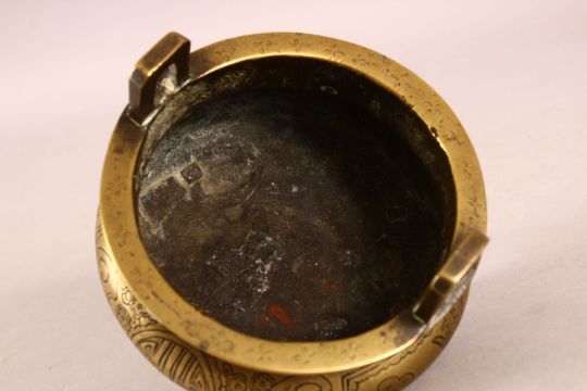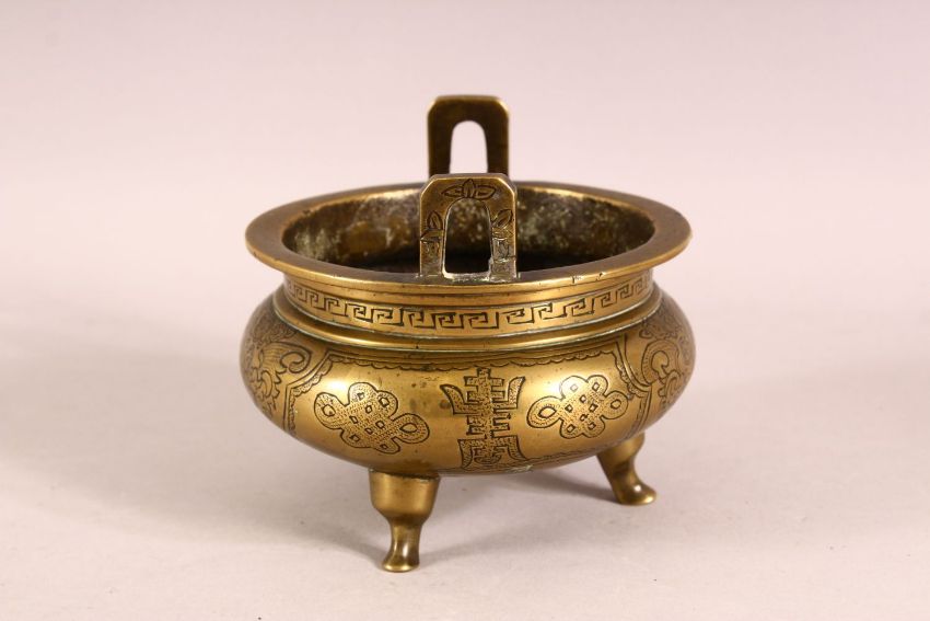 A GOOD 19TH CENTURY CHINESE BRONZE TRIPOD CENSER - the body carved with longevity symbols and bats, the base with a six character mark, with twin handles, 12cm diameter.