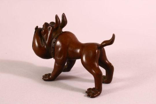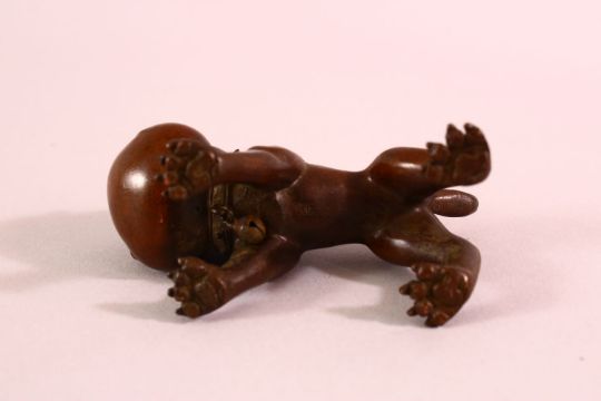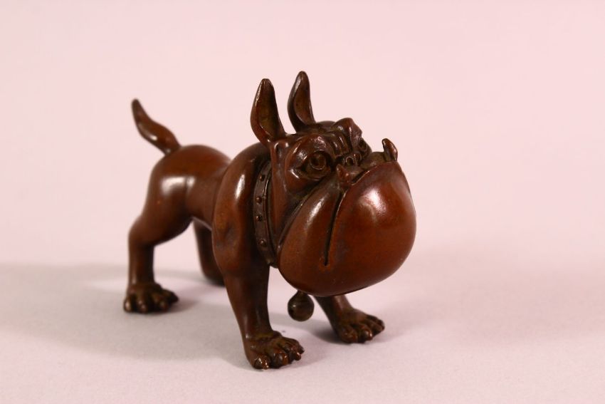 A JAPANESE BRONZE FIGURE OF A DOG - bell to collar and seal to belly, 9cm