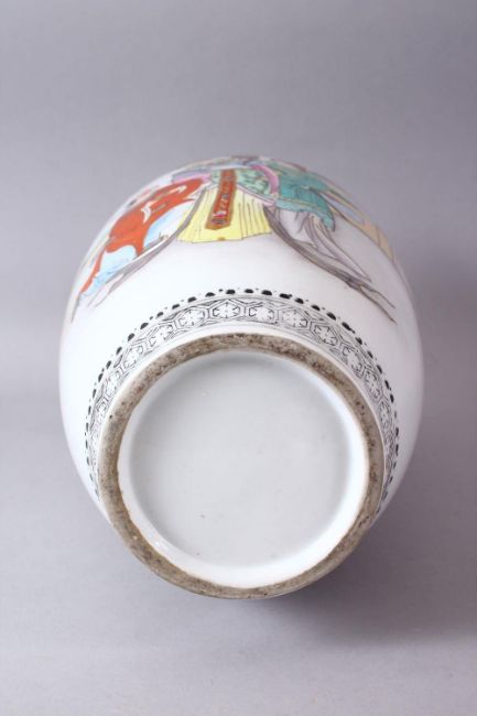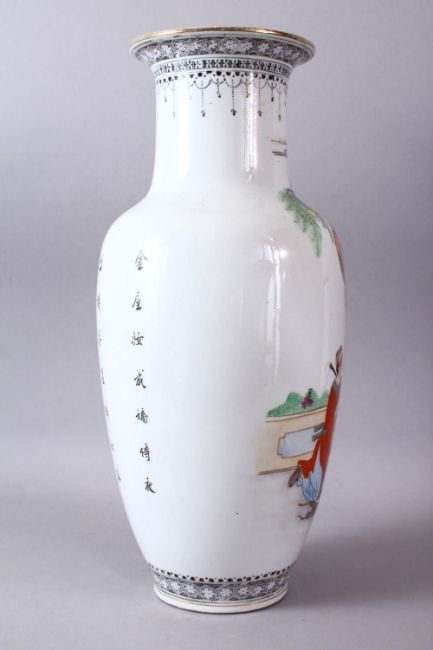 A LARGE CHINESE REPUBLIC STYLE FAMILLE ROSE PORCELAIN VASE, decorated with scenes of a goddess with attendants, the verso with calligraphy, with borders of black motif, 41cm.