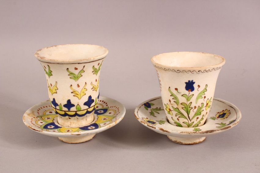 TWO TURKISH CUPS & SAUCERS - with floral motif decoration (4)