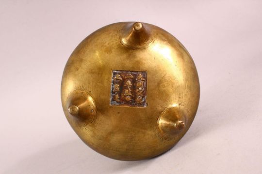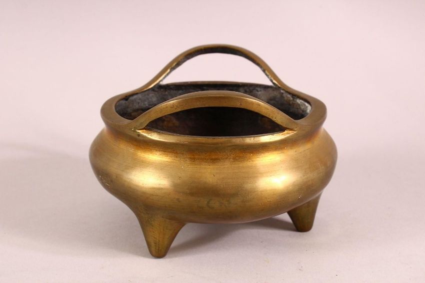 A CHINESE BRONZE TWIN HANDLE CENSER, The underside with an impressed seal, 13cm