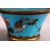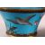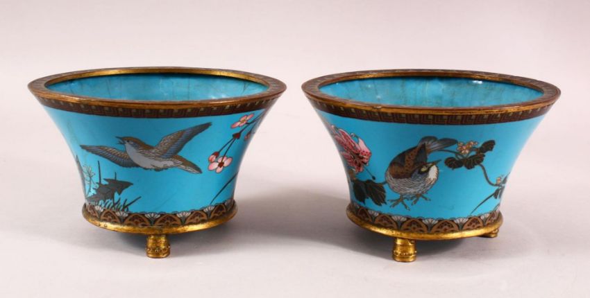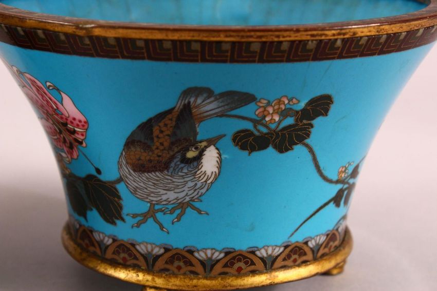 A PAIR JAPANESE CIRCULAR CLOISONNE JARDINIERES, the body decorated with birds and native flora and fauna on blue ground, each supported on three circular feet, 19cm diameter x 12cm high each.
