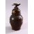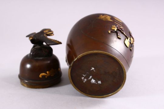 A JAPANESE MEIJI PERIOD BRONZE & MIXED METAL VASE & COVER, the body of the vase with mixed metal inlaid and onlaid decoration depicting dancing and working figures, with inlaid and chased details, the top with the finial of a bird, 6cm high.
