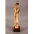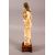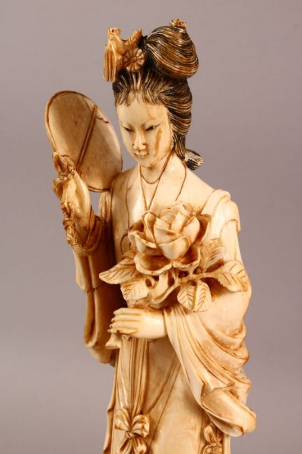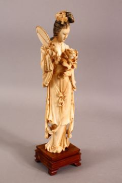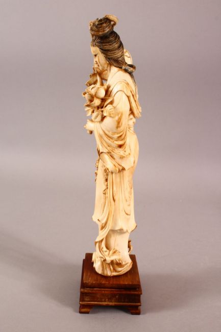 A 19TH / 20TH CENTURY CHINESE CARVED IVORY FIGURE OF GUANYIN GODDESS, the female figure in a stood pose holding her fan and floral arrangement - with a later fitted carved wooden base - ivory alone 26cm