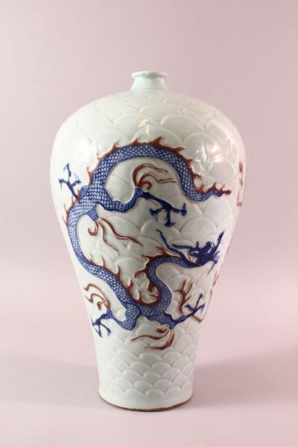 A CHINESE MING STYLE UNDERGLAZE BLUE & COPPER RED DRAGON PORCELAIN VASE - with dragons and flames, with a wave moulded ground 45cm