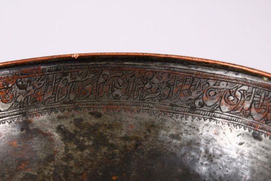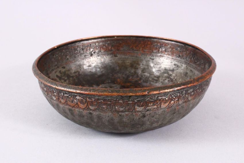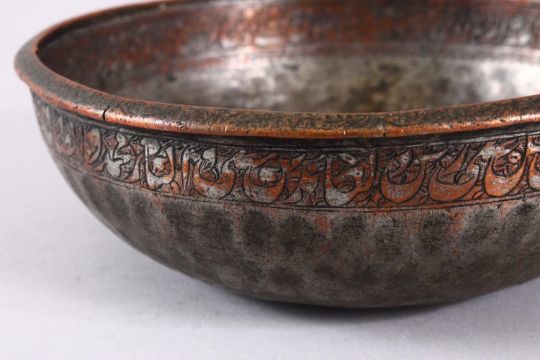 A UNUSUAL ISLAMIC TINNED HAMMERED COPPER CALLIGRAPHIC BOWL, decorated with interior & exterior bands of calligraphy, 17cm diameter.