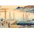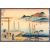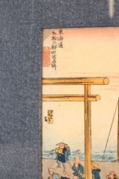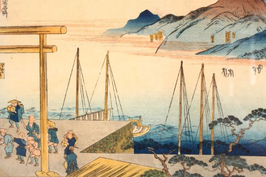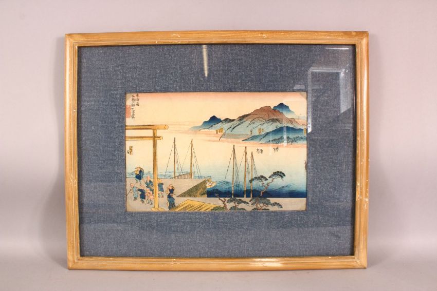 A JAPANESE MEIJI WOODBLOCK PRINT OF A WATERSIDE LANDSCAPE- depicting figures, ships and mountains - artist signed and sealed - framed - 58cm x 47cm