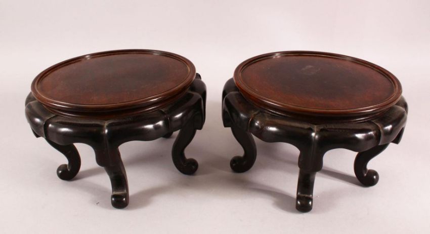 A PAIR OF 19TH CENTURY CHINESE CARVED HARDWOOD STANDS. each with five curving feet, 26cm wide housing a vase no larger than 20.2cm