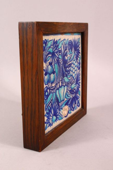 A TURKISH TURQUOISE GROUND FLORAL TILE SECTION, framed, 23cm