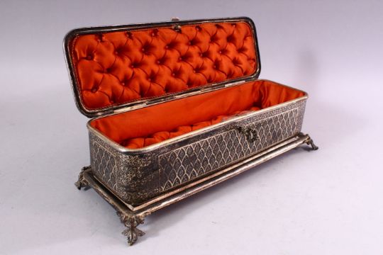 A BIDRI STYLE RECTANGULAR HINGED CASKET for the European market, with panels of scrolling decoration, the interior with deep button padded lining, on leaf cast feet, signed to the lockplate 'Tahan', 30cm long.