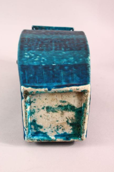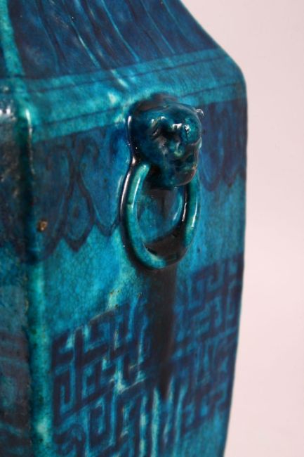 A GOOD 18TH / 19TH CENTURY BLUE GROUND ARCHAIC TWIN HANDLE VASE, with twin lion dog mask handles with rings, the body with archaic design and leaf borders, 33.5cm high