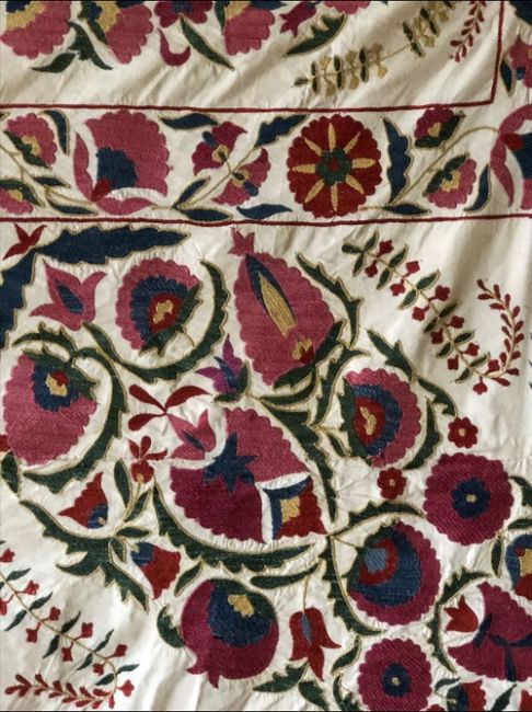 A GOOD LARGE HAND EMBROIDERED COTTON TEXTILE, 20th Century, Susani, 9ft 2ins x 6ft 8ins.