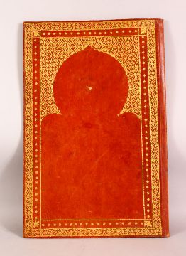AN ISLAMIC LEATHER BOUND AND GILT QURAN COVER - decorated with gilded highlights in mosque form - 49cm x 32cm