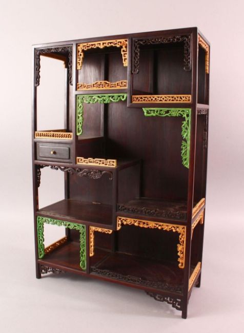 A CHINESE HARDWOOD AND STAINED IVORY MINIATURE CABINET, with carved and stained bone or ivory sections, 40cm wide x 60 cm tall x 15cm deep.