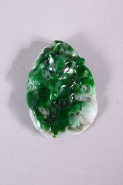 A CHINESE CARVED JADEITE PENDANT, 6cm x 4cm.