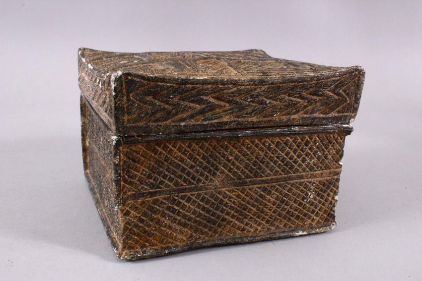 A 19TH CENTURY EGYPTIAN CARVED STONE LIDDED MEDICINE BOX, carved with four sections, and a keyed exterior decor, 15cm x 14cm deep x 10cm high.