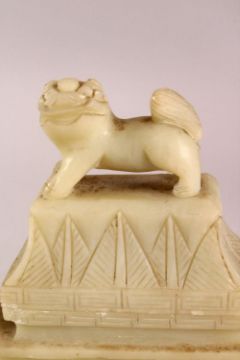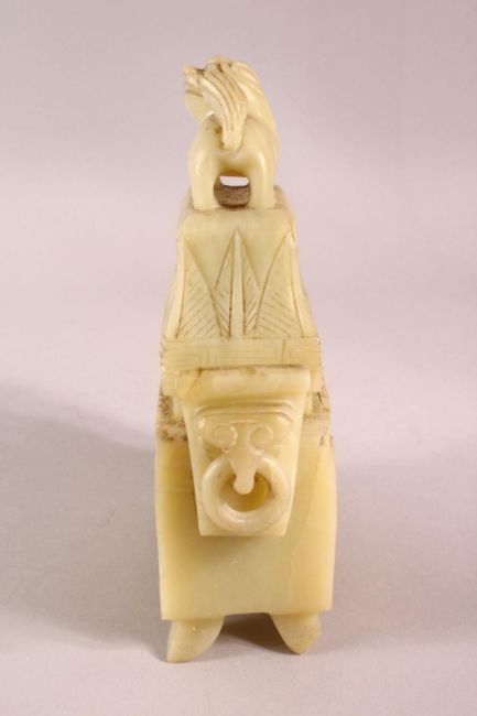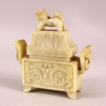 A CHINESE CARVED SOAPSTONE LIDDED CENSER, The body carved with twin handles and stylized bats, the lid with a lion dog finial, 19cm high x 18cm wide.