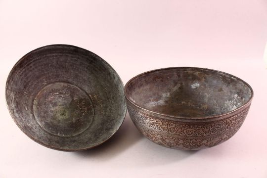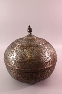 A GOOD 17TH CENTURY PERSIAN TINNED COPPER CALLIGRAPHIC BOWL & COVER - SIGNED MOHAMMAD HERAVI, the body with panels of floral motif decoration, smaller panels of animals, with bands of calligraphy, and a finial, 29.5cm