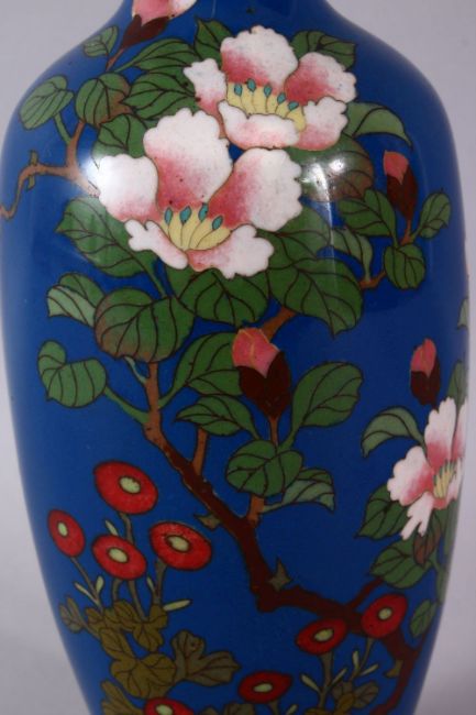 A JAPANESE MEIJI PERIOD CLOISONNE VASE, the blue ground with native display of flora, 24cm high