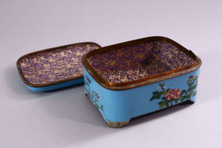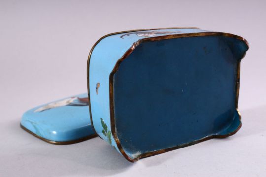 A JAPANESE MEIJI PERIOD CLOISONNE COCKEREL BOX & COVER, the turquoise ground box decorated to the lid with a display of two cockerel, the sides also with similar and butterflies and flora, on four moulded formed feet, the interior fabric lined, 11cm wide x 8.5cm deep. (AF)
