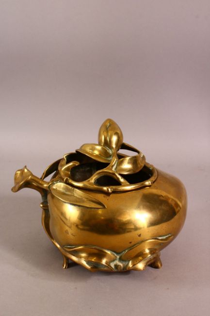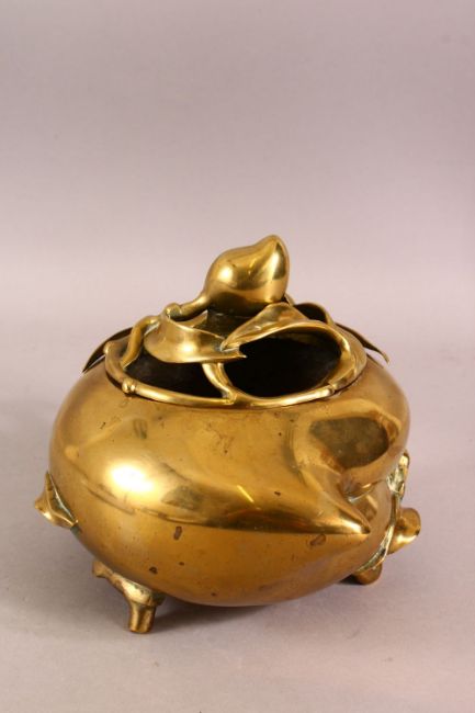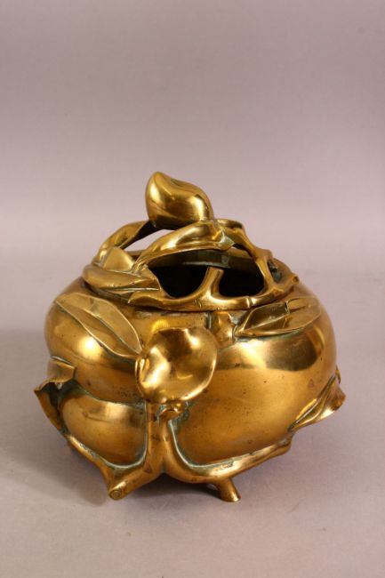 AN UNUSUAL CHINESE PEACH FORMED BRONZE CENSER, the body formed as a peach, stood upon tripod legs formed as the growth, 16cm high x 21cm wide.