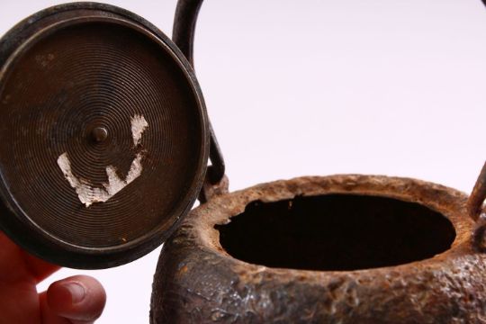 A JAPANESE EDO / MEIJI PERIOD IRON MOULDED BIRD KETTLE & COVER, the iron kettle with side decoration in relief with birds amongst clouds, with a cover, 23cm high x 18cm wide,
