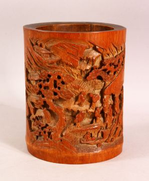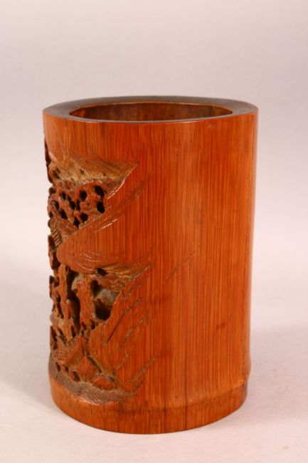 A GOOD CHINESE CARVED BAMBOO BRUSH POT - carved with scenes of landscapes and figures, 18cm high x 15cm.