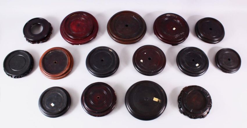 A MIXED LOT OF 15 CHINESE CARVED HARDWOOD STANDS - each of varying size, style and timber, the largest housing a vase no greater than 16.5cm, the smallest 12.3cm.