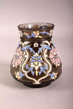 AN ISLAMIC AMBER GLASS VASE with enamel decoration, 12cm high.