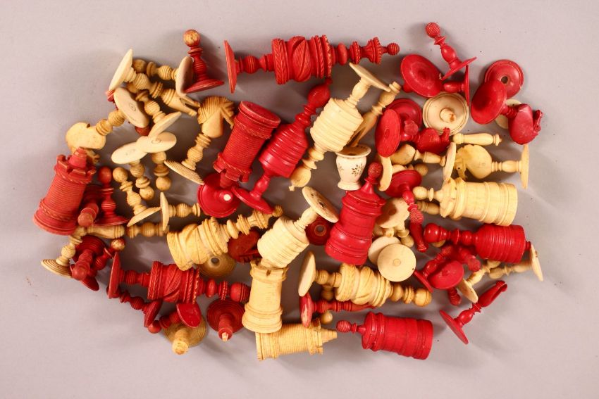 A BAG OF MIXED CARVED IVORY CHESS PIECES, largest 10cm, smallest 5cm.