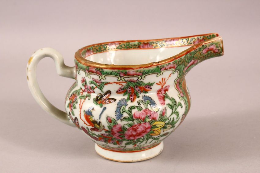 A 19TH CENTURY CHINESE CANTON FAMILLE ROSE PORCELAIN POURING JUG - with figures interior and birds and foliage - 17.5cm