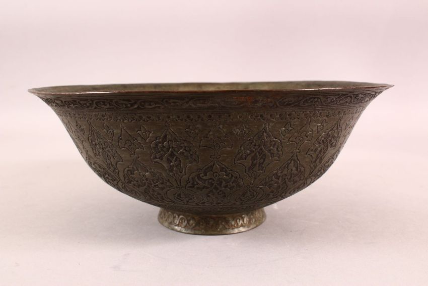 A FINE 17TH/18TH CENTURY PERSIAN SAFAVID TINNED COPPER BOWL, with etched decoration, 27cm diameter.