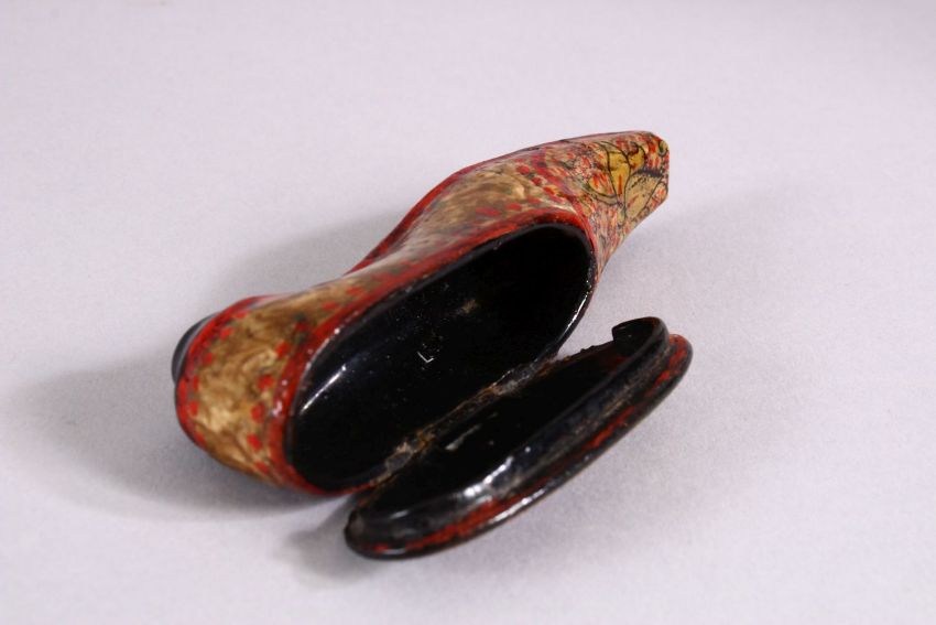 AN UNUSUAL PERSIAN LACQUER PAPIER MACHE SHOE SHAPED SNUFF BOX, The top with the view of a figure, 9cm.