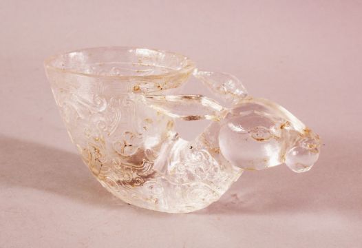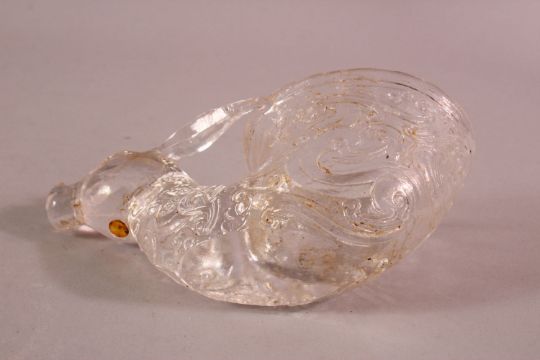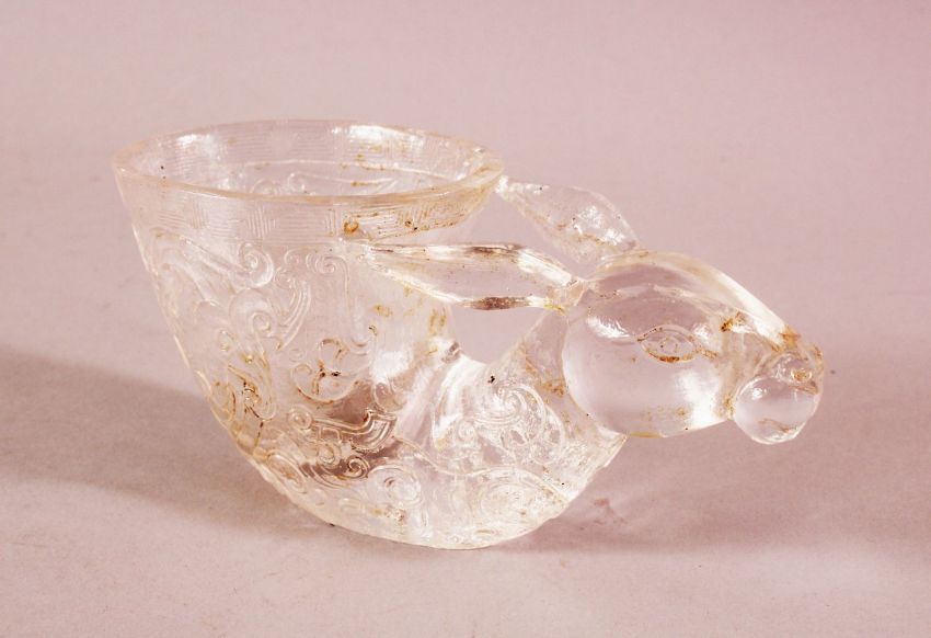 A CHINESE CARVED MOULDED GLASS LIBATION CUP- with a deer head and archaic design, 15cm