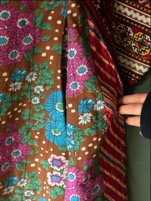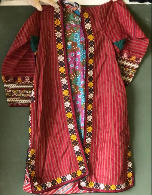 A LONG EMBROIDERED TEKKE COAT, 20th Century, with floral lining and embroidered decoration, approx. 42in waist x 40in long.