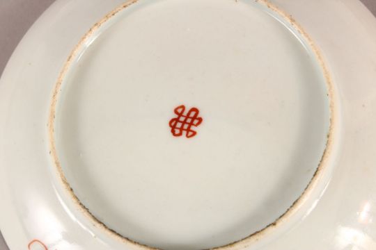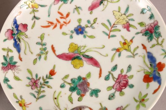 A SET OF 5 19TH CENTURY CHINESE FAMILLE ROSE PORCELAIN SAUCER DISHES - decorated ith flowers and butterlies - the undersides with iron red bats and the endless knot mar - approx 17.5cm (5)