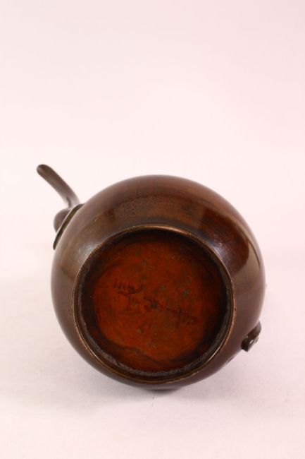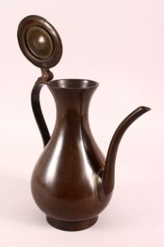 A JAPANESE MEIJI BRONZE TEMPLE EWER, used by monks with a hinged lid, and script to the base, 26cm high.