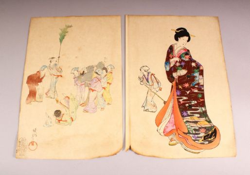A 19TH CENTURY JAPANESE WOODBLOCK TRYPTIC PRINT, Chikanobu Yoshu 1838-1912, from the series of Inner Palace of Chiyoda, together with two others, each section 35cm x 23cm.