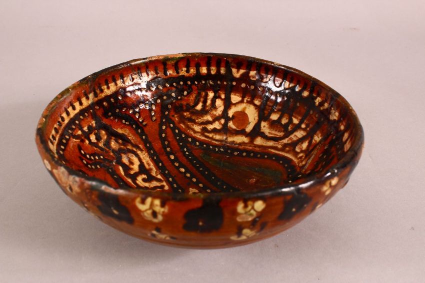 A SMALL PERSIAN BROWN GLAZED TERRACOTTA BOWL, the inner decorated with a stylised bird, 18cm diameter.