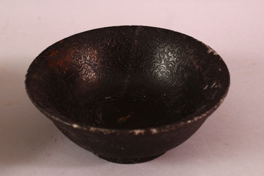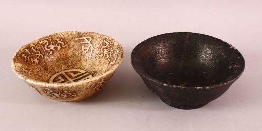 TWO CHINESE CARVED HARDSTONE BOWLS, one carved with symbols and dragons, the other carved with flowers, 15cm diameter and 14.5cm diameter.